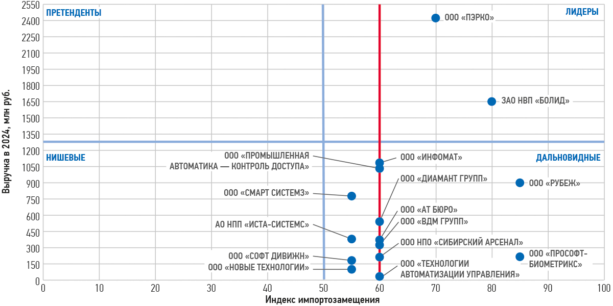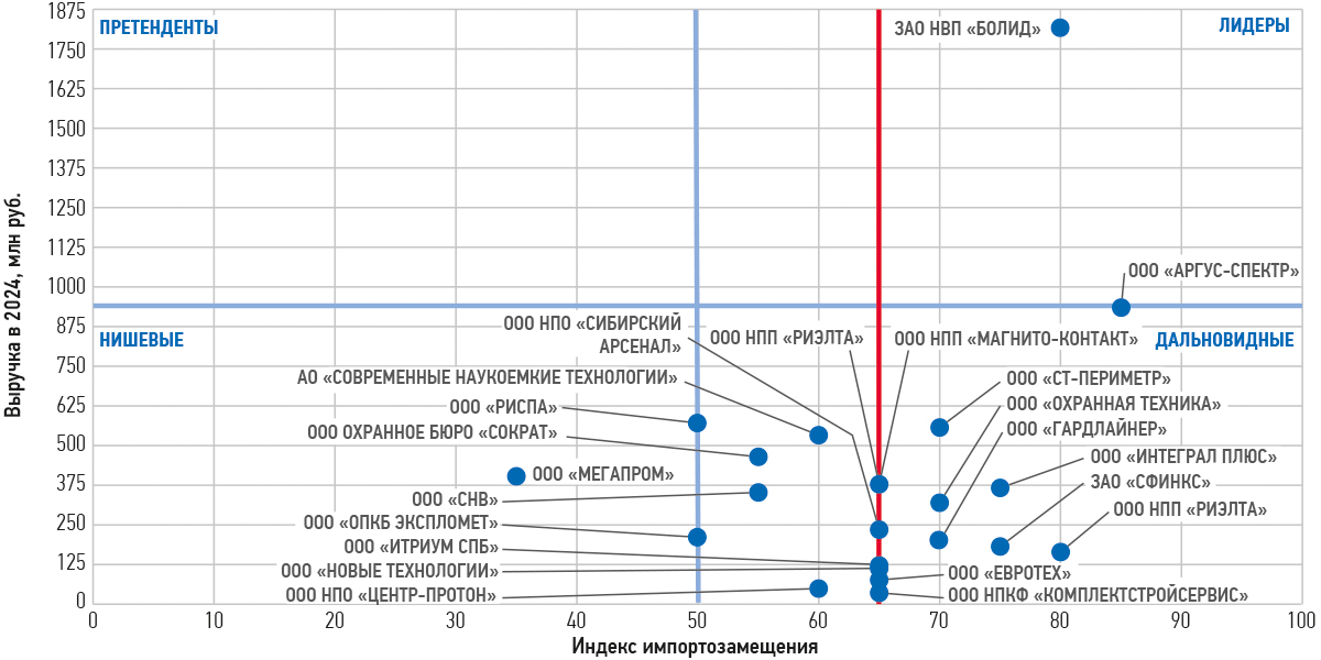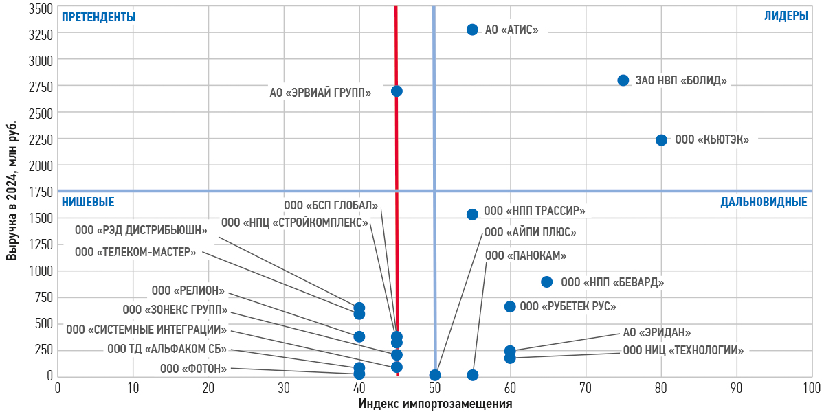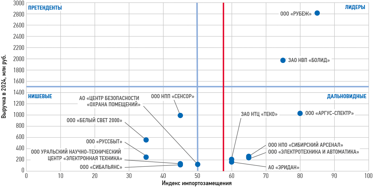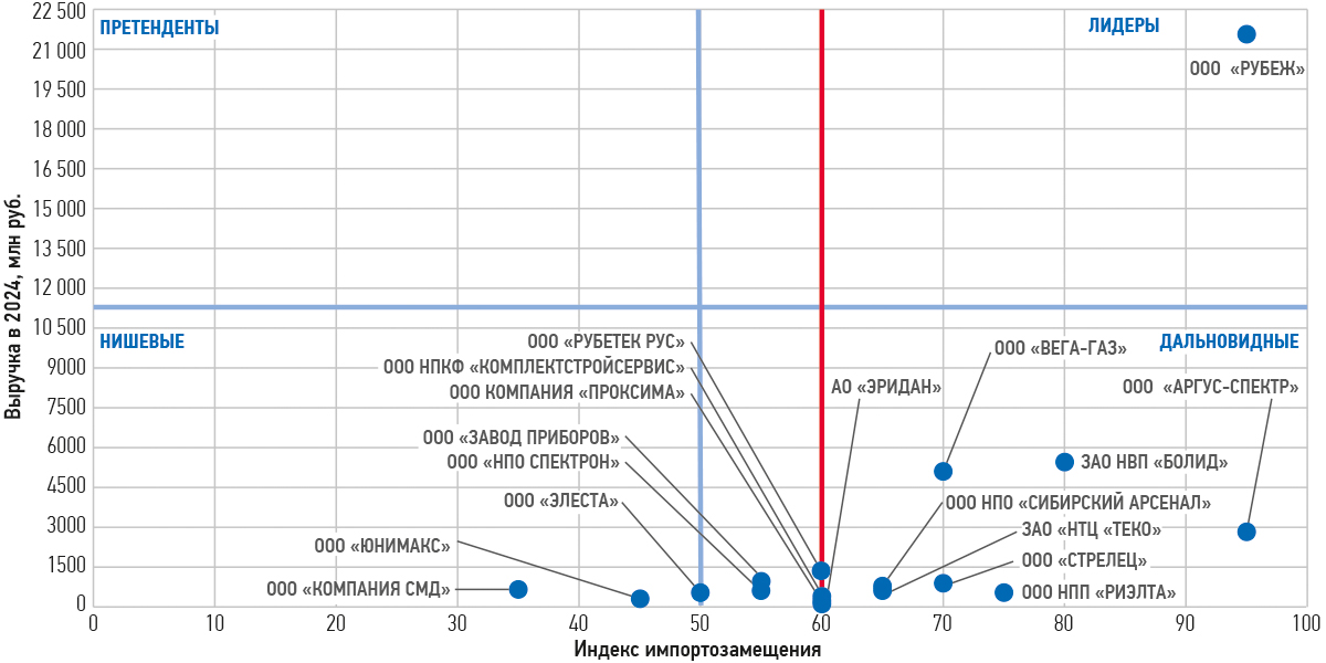 В квадрантах по индексу импортозамещения такими компаниями стали «Рубеж», «Болид», «Атис», «Кьютек», «Пэрко», «Аргус-Спектр», ПО «Спецавтоматика», «Пожтехника», «Марпосадкабель».