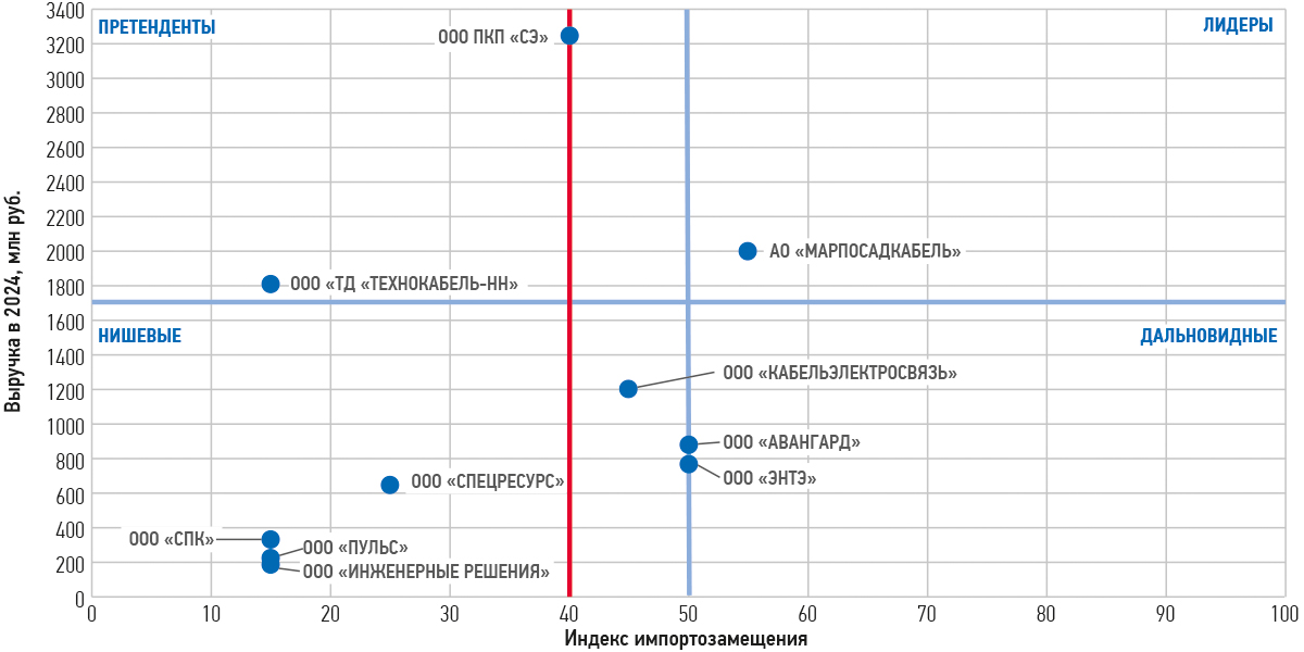 В сегменте «Спецкабели» при этом сложилась ситуация, когда лидеры по баллам — НПП «Спецкабель» и «Рыбинский кабельный завод» (по 65 баллов) — официально не опубликовали в открытых источниках финансовых итогов своей деятельности в 2024 году, поэтому назвать их полноценными лидерами соответствующего сегмента можно с достаточной долей допущения.
