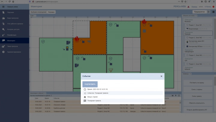 - мониторинг состояния и управление устройствами ОПС “Болид” в интерфейсе системы контроля доступа PERCo-Web